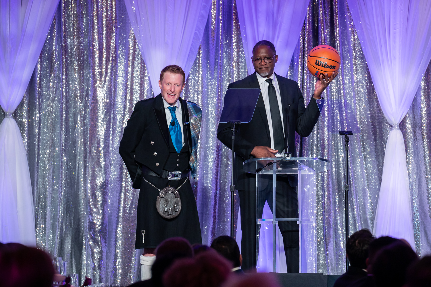 - Pictured (left to right): Jordan Campbell, Gala Auctioneer, and Dominique Wilkins, Atlanta Hawks Hall of Famer